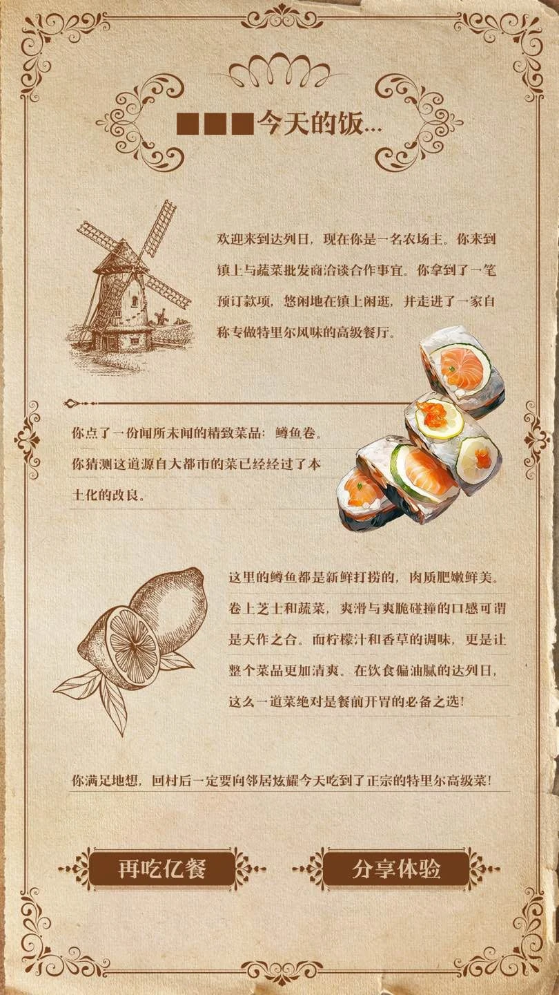 The grilled fish is enveloped in a special blend of straw-like spices from the Rorsted Archipelago, promising a progressive and enduring aftertaste. To savor this delicacy, one must employ chopsticks, a unique utensil. It’s said that Emperor Roselle gained inspiration from the customs of the elves.[13]