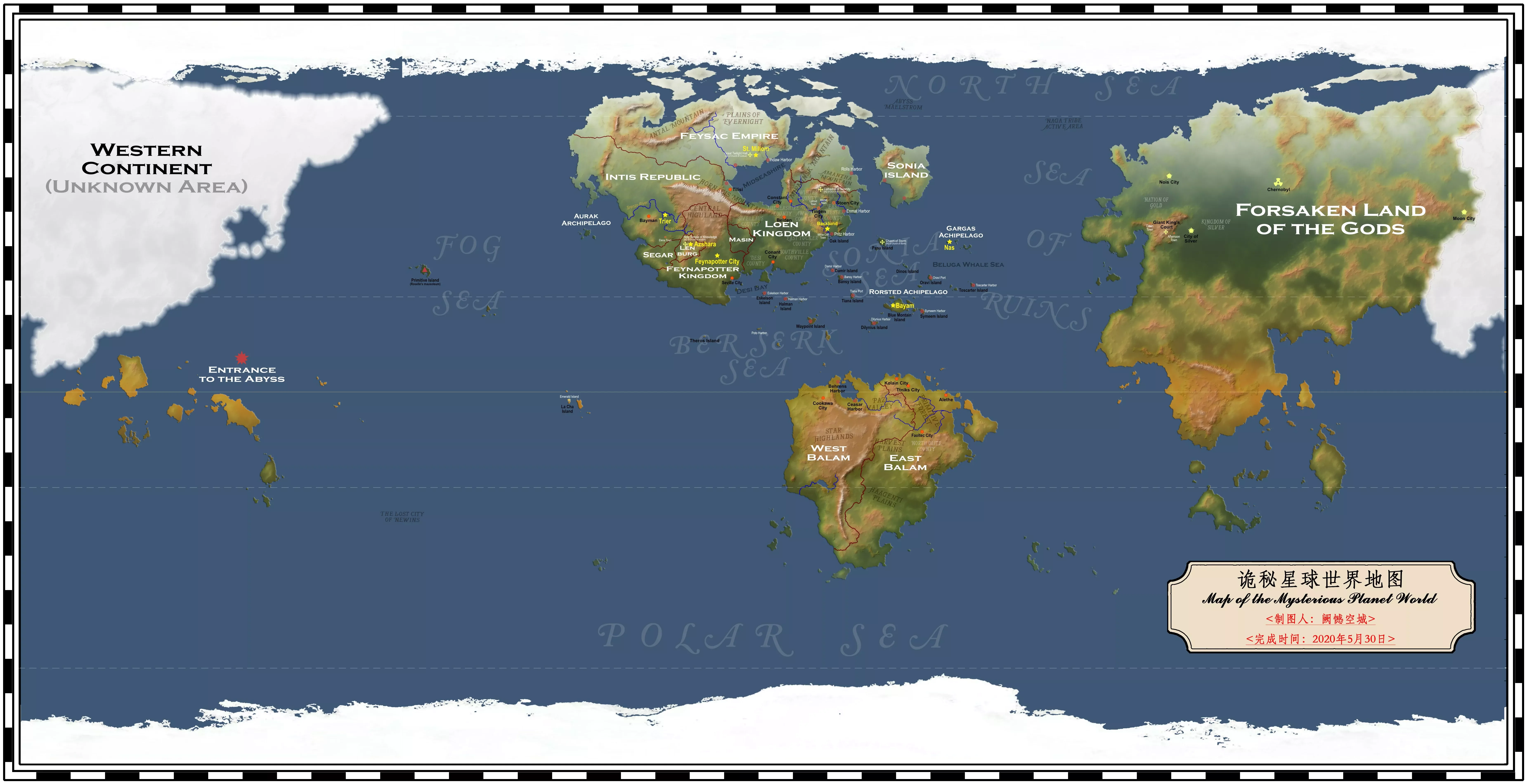 Located on the west of the Northern Continent and the Southern Continent. The notables islands are Fog Sea Archipelago, the first colony of the Intis Republic. Some islands have relationships with Feynapotter Kingdom.